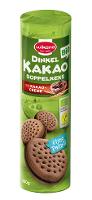 Dinkelmehl* (eine Weizenart) (47 %), Zucker*, Sonnenblumenöl*, Kakaopulver* stark entölt (6,3%), Kakaobutter*, Kokosöl*, Maisstärke*, Backtriebmittel (Natriumhydrogencarbonat), Meersalz, Emulgator (Lecithin*).| Energie | Fett | gesättigte Fettsäuren | Kohlenhydrate | Zucker | Ballaststoffe | Eiweiss | Salz |