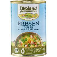Trinkwasser, 23% Erbsen*, Fleisch* (Schwein*, Rind*), Kartoffeln*, Karotten*, Lauch*, Zwiebeln*, Sonnenblumenöl*, SELLERIE*, Steinsalz, Maisstärke*, Meersalz, Verdickungsmittel: Guarkernmehl*; Rohrohrzucker*, Gewürze* (Macis*, Curcuma*, Pfeffer*, Ingwer*, Knoblauch*, Koriander*, Kümmel*), Kräuter* (Liebstöckel*, Petersilie*, Rosmarin*, Oregano*), Dextrose*, Schafsaitling, Rauch.| Energie | Fett | gesättigte Fettsäuren | Kohlenhydrate | Zucker | Ballaststoffe | Eiweiss | Salz |