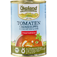 Trinkwasser, 13% Tomatenmark*, 6% Tomaten*, 4,8% SCHLAGSAHNE*, Rohrohrzucker*, Steinsalz, Maisstärke*, Sonnenblumenöl*, WEIZENSTÄRKE*, WEIZENMEHL*, Zwiebeln*, Karotten*, Gewürze* (Macis*, Curcuma*, Pfeffer*), Kräuter* (Liebstöckel*, Petersilie*, Rosmarin*, Oregano*, Basilikum*), Verdickungsmittel: Guarkernmehl*.| Energie | Fett | gesättigte Fettsäuren | Kohlenhydrate | Zucker | Ballaststoffe | Eiweiss | Salz |
