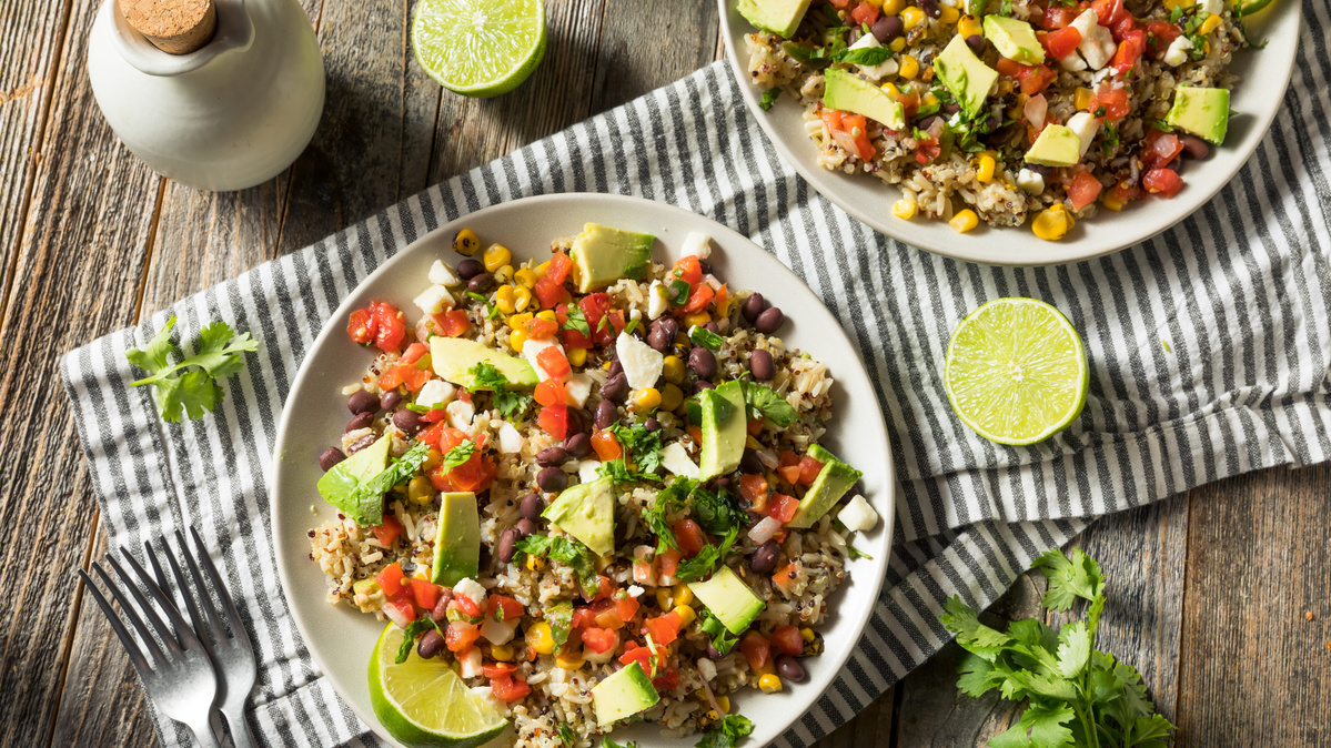 Nun die Burrito Bowl in breiten Schüsseln oder Schalen zusammenstellen: Zuerst etwas Reis in ein Achtel jeder Schüssel geben. Dann alle anderen Zutaten getrennt voneinander daneben verteilen. Zwiebeln können auch darüber gestreut werden. Bei Bowls darf man kreativ sein. Achtung: Bereitet man die Bowl vor, z.B. als Meal Prep oder Salat, sollten die Zwiebeln erst kurz vorm Servieren untergerührt werden.