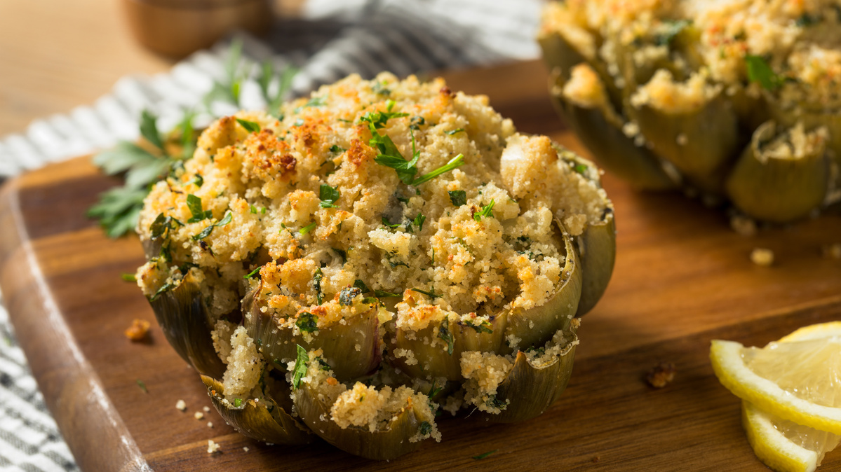 Habt ihr schon einmal frische Artischocken zubereitet? Wenn nicht, dann wird es jetzt Zeit! Denn wer sie nur in eingelegter Form kennt, wird überrascht sein von dem Geschmacksprofil dieser besonderen Blüte. Ja, Artischocken sind eigentlich die Blütenstände einer Distelart – daran erinnert das im Inneren liegende, piksende ‚Stroh‘, welches vor der Zubereitung sorgfältig entfernt werden muss. Aber keine Sorge, die Zubereitung von Artischocken ist gar nicht so kompliziert, wie es scheint. Unser klassisches Rezept für gefüllte Artischocken beweist das und ist perfekt für alle, die mal etwas Neues ausprobieren wollen. Mit dem passenden Dip aus Butter und Zitrone ein echter Genuss!