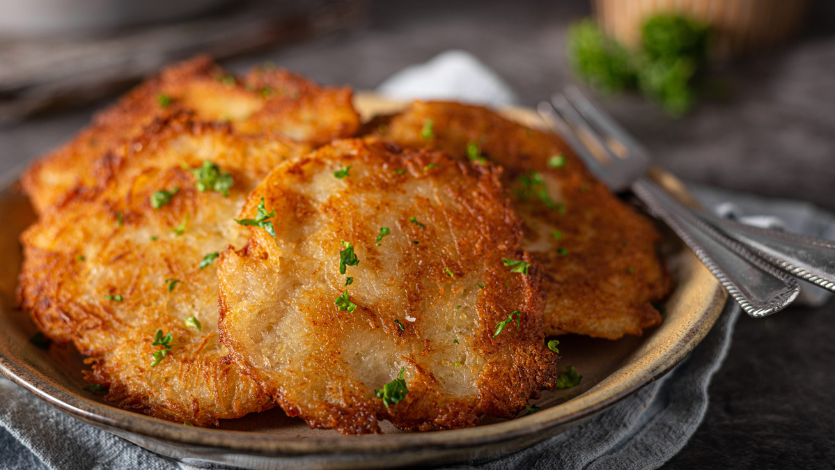 In der Zwischenzeit die Kartoffeln schälen und fein raspeln. In einem Sieb oder mit einem Mulltuch ordentlich ausdrücken, die Flüssigkeit dabei in einer Schüssel auffangen. Wichtig: Je trockener die Kartoffelmasse, desto knuspriger werden die Puffer.