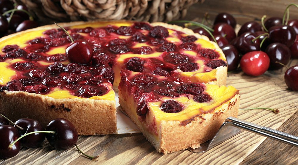 2. Den Backofen auf 180°C vorheizen. Die Kirschen waschen und entsteinen. Eine runde Kuchenform ausfetten und mit dem fertigen Teig für den Kuchenboden auskleiden. Dann die Füllung behutsam hineinfüllen und die Kirschen darauf verteilen. Sie sollten etwas in die Füllung einsinken.