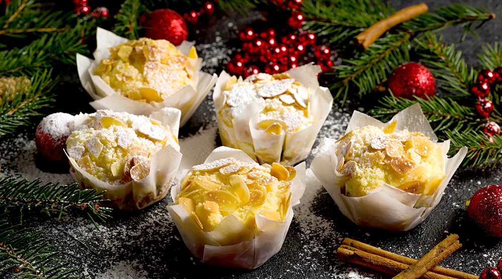 Den Teig in ein gefettetes Muffinblech oder Papierförmchen geben und mit Mandelplättchen bestreuen. Die Muffins für 25 Minuten backen, bei zu starker Bräunung eventuell im Ofen abdecken.
