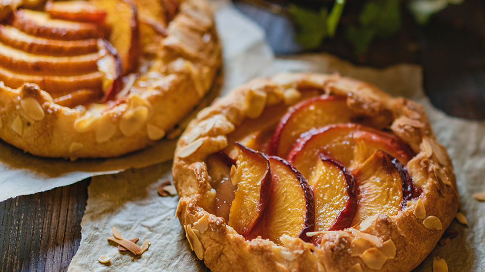 4. Den Mürbeteig in vier gleich große Stücke teilen, Kugeln formen und auf eine Dicke von ca. einem halben Centimeter ausrollen. Dann auf eine mit Backpapier ausgelegtes Backblech legen und mit den Pfirsichscheiben belegen. Dabei außen jeweils einen Rand von mindestens 2 bis 3 cm frei lassen. Diesen umklappen und einfalten, mit etwas Milch bepinseln und mit Mandelplättchen bestreuen.